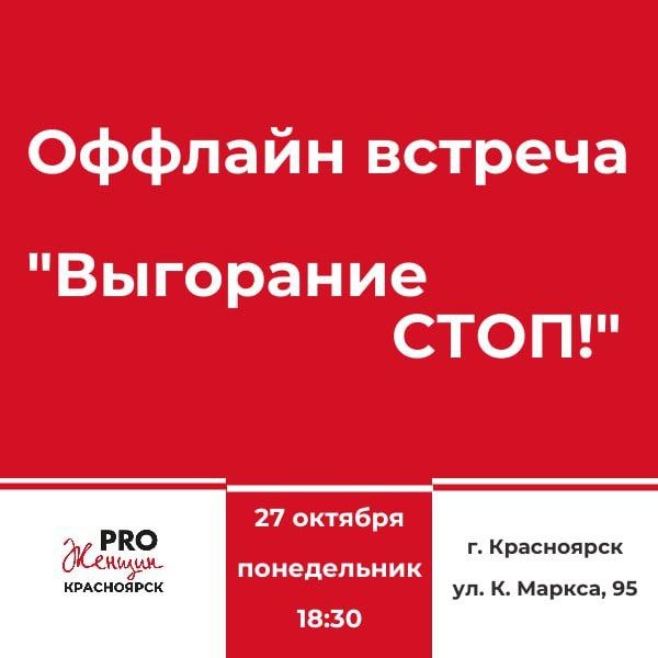 Ежемесячная встреча, посвященная профилактике профессионального выгорания становится хорошей традицией сообщества PRO Женщин в Красноярске ❗️Если есть ощущение, что изменилось отношение к работе, если отдых уже не восстанавливает 📆 27 октября в 18:30 приглашаем на встречу "Выгорание СТОП!" Участие безоплатное! 🎁 На встрече: ⬅ Поговорим о причинах и признаках профессионального выгорания ⬅ Разберём 4 патогенных фактора рабочего места, которые ведут к выгоранию ⬅ Обсудим, что же со всем этим делать, виды отдыха, нюансы восстановления ресурса и профилактики выгорания ⬅Познакомимся, пообщаемся на актуальную тему в атмосфере безопасности и поддержки Спикеры: Ольга Рамазанова - лидер сообщества PRO Женщин, эксперт по профессиональной идентичности Надежда Рукосуева - куратор проекта Профессии PRO Женщин 🔘 27 октября в 18:30 🔘г.Красноярск, ул. К.Маркса 95 Travelers coffee 🔘Количество участниц 6 Для регистрации пишите в личные сообщения Ольге Рамазановой @ollga_ra 🌸 Поделитесь постом