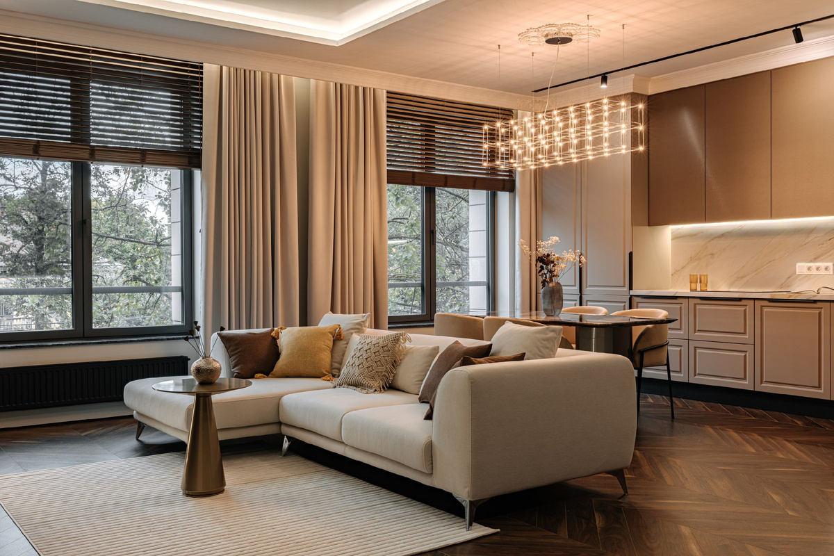 Плотные шторы, лаконичная мебель и текстурный пол создают ощущение целостности, а ковер, подушки и вазы завершают образ. Их оттенки напоминают цвета осени: сливочный, песочный, молочный, кофейный — мягкие, но выразительные.