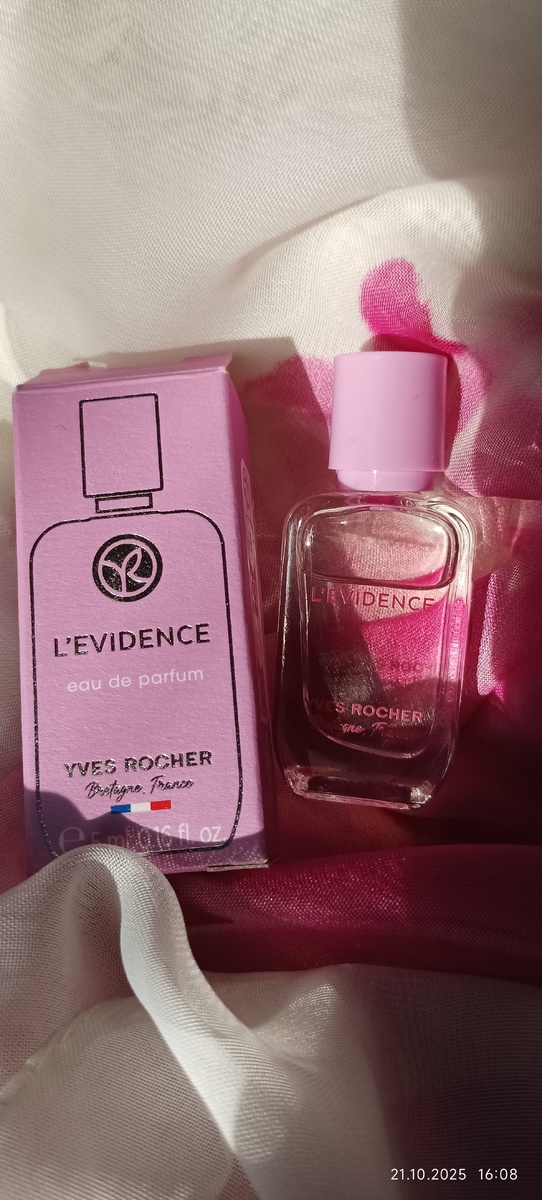 Аромат 2025 года от Ives Rocher L'Evidence. Парфюмерная вода L'Evidence относительно новый аромат от 2025 года.Это ещё один фланкер из серии Эвиденсов,которая в переводе с французского означает Ясность,Реальность . Из всех представленных вариантов этой серии мне понравился именно этот последний .потому что он самый женственный,нежный и красивый. Флакон находится в очень красивой розовой коробочке,которая сразу привлекает взгляд в магазине.Сам флакон простой,прозрачный ,с розовой крышечкой.У меня минималка 5 мл.Но большие флаконы не отличаются по цвету и дизайну .Только размером. Пирамида аромата простая. Бергамот,персик,дамасская роза,магнолия,пачули Относится к шипровым цветочным. Мои впечатления. Очень красиво звучит с первого нанесения.Слышится густая и сладковатая роза,магнолия немного цитруса.Персика и пачулей я совсем не чувствую.Аромат нежный,про розу и магнолию.Постепенно чувствуется некоторая шипровость,но совсем немного. Держится на коже немного,примерно часа 2 ,А на оде