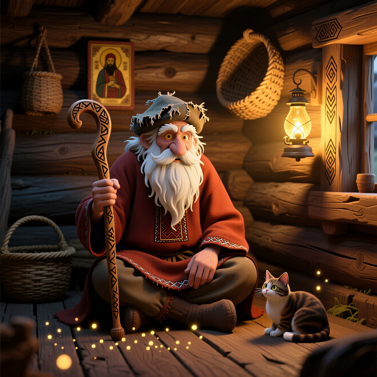 На краю дивана сидел старичок. Совсем маленький — ростом не выше метра. Он опирался на толстую деревянную палку, подбородок его покоился на сложенных ладонях, а глаза… Глаза были прозрачными, как у кошки в темноте, — не пугающими, но глубокими, словно в них отражалась вся история этого дома. Лицо его напоминало запечённое яблоко — морщинистое, сморщенное, но с каким-то внутренним теплом. Борода — клочками, будто её выщипали птицы. На голове у него была старая потрёпанная шляпа, как у лесника из сказки. Он просто смотрел на Веру. Без злобы. Без страха. Просто… наблюдал.