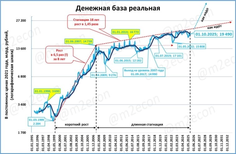 Если на этом графике посмотреть серьезные минимумы и максимумы голубой линии, то получим вот такое для индекса Мосбиржи: ▪️01.03.1999 — 01.06.2007 +1824.63% ▪️01.04.2009 — 01.04.2011 +134.64% ▪️01.06.2015 — 01.01.2019 +56.67% ▪️01.10.2022 — 01.09.2023 +60.08% Если посчитать доходность только за эти четыре периода, то получим рост индекса Мосбиржи +11225.72%, а его реальный рост с 01.03.1999 только +2988.49%. Очевидно, что нужно для роста рынка! Да будет " как надо" с этого графика! Спасибо Сергею Блинову за отличный график для нашего фондового рынка https://smart-lab.ru/mobile/topic/1220597/