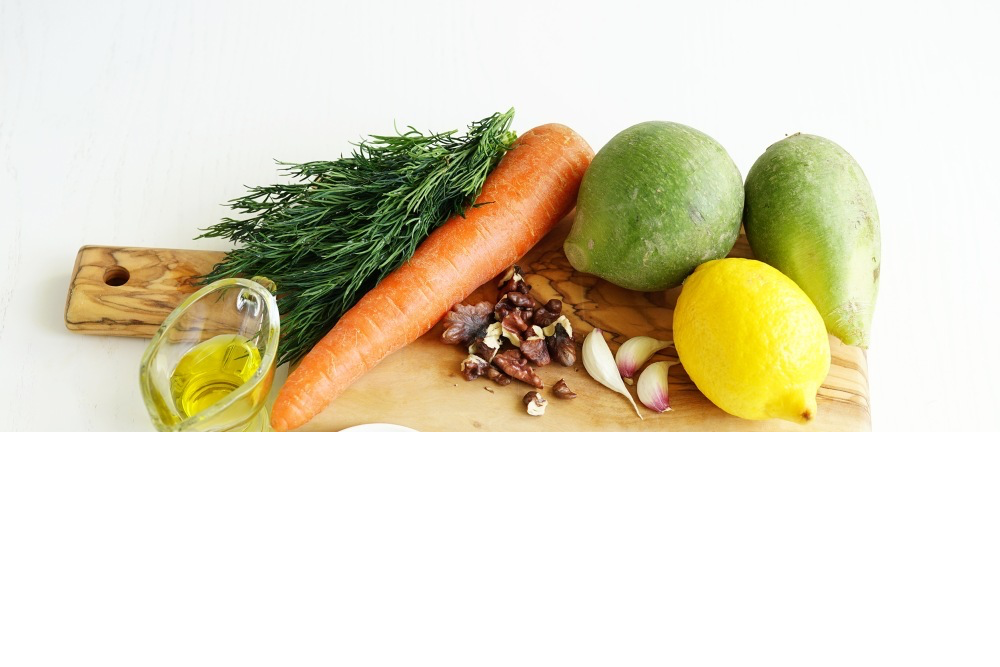 Салат из зелёной редьки В салате из зеленой редьки содержится колоссальное количество витаминов. Это очень полезный овощ, и его тоже можно приготовить вкусно. Калорийность (100g): 94 ккал Ингредиенты: Редька – 250 г зелёная Морковь – 100 г Масло оливковое – 30 г Сок лимонный – 1 ст.л. Орехи грецкие – 15 г Чеснок – 10 г Соль – 0.5 ч.л. Перец черный – 0.5 ч.л. Укроп – 5 веточка (-и) Приготовление: Шаг 1 Подготовить все ингредиенты для приготовления салата из зелёной редьки. Шаг 2 Морковь и редьку очистить от кожуры и промыть. Конечно, данный салат можно приготовить и без моркови. Но именно морковь очень гармонично оттеняет вкус редьки, добавляя салату небольшую сладость. Шаг 3 Подготовить зелёную редьку для салата. Натереть её на тёрке для корейской моркови. Если у вас нет такой тёрки, то можно воспользоваться обычной тёркой и измельчить зелёную редьку на крупной секции. Можно, конечно, и нарезать зелёную редьку очень тонкой соломкой, но на это потребуется гораздо боль