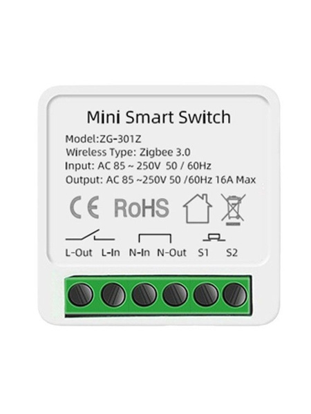 Название: Умный мини-выключатель Tuya Модель: ZG-301Z Характеристики: Поддержка приложений: Tuya / Smart Life Максимальный ток: 16 А Выход: 100–240 В переменного тока, 50/60 Гц Вход: 100–240 В переменного тока, 50/60 Гц Протокол передачи данных: Zigbee: 3.0 Функционал: смыкание / размыкание электрической цепи; Описание: Mini Smart Switch ZG-301Z представляет собой электронный выключатель сети переменного тока 100-220V, работающий по беспроводному интерфейсу Zigbee 3.0. Устройство собрано в пластиковом белом корпусе прямоугольной формы с миниатюрными размерами 41×41×22мм, что позволяет установить его в стакан подрозетника за выключателем. Такой способ установки, как правило, применяется в случае подключения к устройству дублирующего кнопочного (физического) выключателя. В нижней части лицевой стороны реле имеется шесть контактов: L-In, N-In, L-Out, N-Out, S1-S2. Питание 220 вольт подается на входы L-In, N-In, к потребителю идут выходы L-Out, N-Out, выключатель (при необходимости) подсое