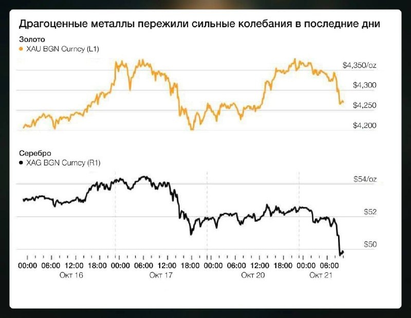 💥 Золото и серебро рухнули — впервые за 12 лет В начале года металлы били рекорды: золото взлетело почти на 60 %, серебро — на 80 %. Но на прошлой неделе за один день они обвалились сильнее, чем с 2013 года: • золото просело на 6,3% — это крупнейшая внутридневная просадка за более чем десятилетие. • серебро упало на 8,7%. 📉 Что произошло 🟡 Укрепился доллар и выросла доходность казначейских облигаций США — традиционно это давит на цены драгоценных металлов. 🟡 Фиксация прибыли: инвесторы закрывали позиции после ралли, где золото и серебро подорожали на десятки процентов с начала года. 🟡 Перегрев рынка: объём торгов опционами на золото, по данным Bloomberg, достиг рекорда. Любой разворот провоцирует лавину продаж. 💡 Почему это важно Золото и серебро — это барометры доверия к мировой экономике. Их массовая распродажа сигнализирует, что инвесторы отдают предпочтение более рисковым активам. Сейчас это выглядит как передышка после перегрева, а не окончательный разворот. Если до