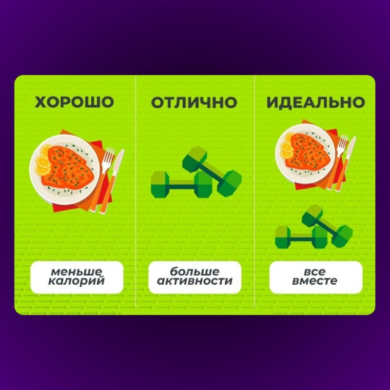 Контроль веса — это вопрос энергоэффективности📊 Тело живёт по простой формуле: калории, которые ты съедаешь — калории, которые ты тратишь = твой вес. 📉 Если потребляешь меньше, чем тратишь — вес снижается (дефицит ккал) 📈 Если потребляешь больше — растёт (профицит ккал) ⚖️ Если балансируешь ровно — вес стабилизируется. ВСЁ. Никакой магии. Обычная математика. И как бы ни хотелось верить в «гормональные сбои», «замедленный метаболизм» или «у меня кость широкая» — математику не обманешь. Энергия не исчезает просто так. Если она поступает — она должна куда-то деться: в тепло, в движение или… в жир. Поэтому если стоит задача похудеть, у тебя всего 3 варианта: 1. Только диета🥗 Если тебе лень или нет времени заниматься — просто ешь меньше! Сократи калорийность, убери перекусы, сахар, добавь больше клетчатки. Да, ты будешь терять вес медленнее, но дефицит всё равно сработает. 2. Только тренировки💪🏻 Если не можешь «захлопнуть варежку» — увеличивай расход! Ходи пешком, занимайся в