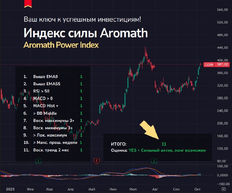 ⚡️ 11 фильтров, одно решение: актив сильный или нет. На Большом и Мощном Вебинаре 16.10.2025 я подарил всем уникальный инструмент - Индекс силы Аromath 💪 Aromath Power Index. Он показывает, насколько актив действительно силён - без догадок, субъективных мнений и эмоций. 📊 Как работает Индекс силы Aromath? Каждый актив оценивается по 11 параметрам на дневном графике: • Цена выше EMA9 • Цена выше EMA55 • RSI выше 50 • MACD-линии выше 0 • Столбики MACD больше 0 • Цена выше средней линии Боллинджера • Максимумы растут 3 дня подряд • Минимумы растут 3 дня подряд • Закрытие дня выше предыдущего локального максимума • Цена выше максимума прошлой недели • Есть ли за два месяца восходящий тренд, видимый без инструментов? Каждое «ДА» = 1 балл, «НЕТ» = 0 баллов. Сумма — и есть сила актива. Интерпретация: > = 9 - Сильный актив, лонг возможен < 9 > 6 - Средний актив, можно/нужно присмотреться < 6 - Слабый актив, лучше не трогать Теперь достаточно добавить Aromath Power Index в свой набор ин