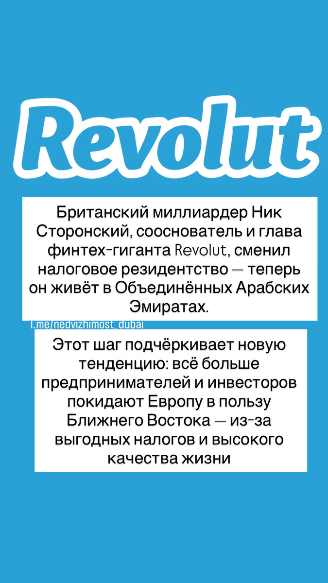 CEO Revolut переехал в ОАЭ! Британский миллиардер Ник Сторонский, сооснователь и глава финтех-гиганта Revolut, сменил налоговое резидентство — теперь он живёт в Объединённых Арабских Эмиратах. Этот шаг подчёркивает новую тенденцию: всё больше предпринимателей и инвесторов покидают Европу в пользу Ближнего Востока — из-за выгодных налогов и высокого качества жизни.