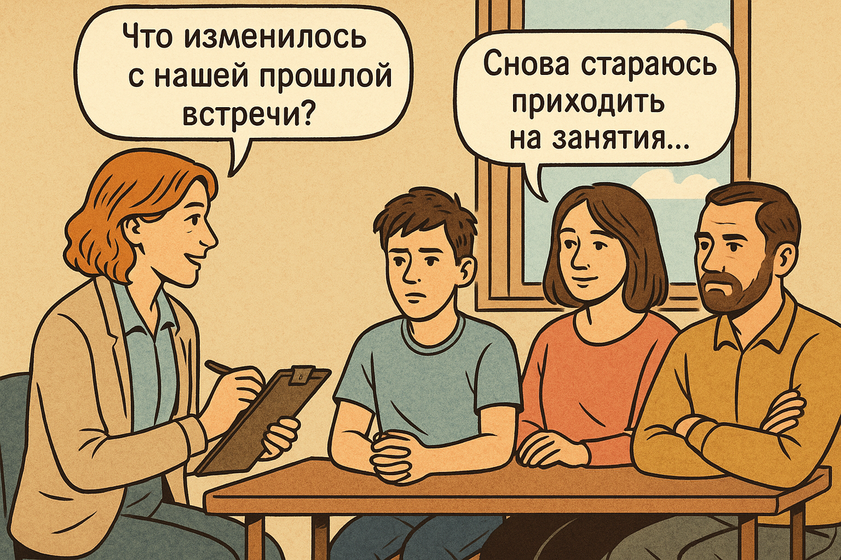 π¬ ΠΠ΅ΠΉΡ: ΠΠ°Π»ΡΡΠΈΠΊ 13 Π»Π΅Ρ. ΠΠ³ΡΠ΅ΡΡΠΈΡ, ΠΏΡΠΎΠΏΡΡΠΊΠΈ, ΠΊΠΎΠ½ΡΠ»ΠΈΠΊΡΡ Π² ΡΠΊΠΎΠ»Π΅. ΠΠ° Π·Π°ΡΠ΅Π΄Π°Π½ΠΈΡΡ Π·Π²ΡΡΠΈΡ ΠΏΡΠΈΠ²ΡΡΠ½ΠΎΠ΅: Β«Π±Π΅Π·ΠΎΡΠ²Π΅ΡΡΡΠ²Π΅Π½Π½ΡΠΉΒ», Β«Π»Π΅Π½ΠΈΠ²ΡΠΉΒ», Β«ΡΠΎΠ΄ΠΈΡΠ΅Π»ΠΈ Π½Π΅ ΡΠΏΡΠ°Π²Π»ΡΡΡΡΡΒ». ΠΠΎΡΠ»Π΅ ΠΏΠ΅ΡΠ²ΠΈΡΠ½ΠΎΠΉ ΠΎΡΠ΅Π½ΠΊΠΈ ΡΠΈΡΠΊΠΎΠ² ΡΠΎΠ·Π΄Π°ΡΡ ΠΏΠ»Π°Π½ ΠΏΠΎΠ΄Π΄Π΅ΡΠΆΠΊΠΈ: ΠΏΠΎΠΌΠΎΡΡ ΠΏΡΠΈΡ ΠΎΠ»ΠΎΠ³Π°, ΡΡΠ°ΡΡΠΈΠ΅ Π½Π°ΡΡΠ°Π²Π½ΠΈΠΊΠ°, ΠΈΠ½Π΄ΠΈΠ²ΠΈΠ΄ΡΠ°Π»ΡΠ½ΡΠ΅ Π±Π΅ΡΠ΅Π΄Ρ Ρ ΠΏΠ΅Π΄Π°Π³ΠΎΠ³ΠΎΠΌ. Π§Π΅ΡΠ΅Π· Π΄Π²Π° ΠΌΠ΅ΡΡΡΠ° β Π²Π½Π΅ΡΠ½Π΅ Π½ΠΈΡΠ΅Π³ΠΎ Π½Π΅ ΠΈΠ·ΠΌΠ΅Π½ΠΈΠ»ΠΎΡΡ. ΠΠΎΠ½ΡΠ»ΠΈΠΊΡΡ ΡΠ»ΡΡΠ°ΡΡΡΡ, ΠΎΡΠ΅Π½ΠΊΠΈ ΡΠ΅ ΠΆΠ΅, Π½Π° ΡΡΡΡΠ΅ ΠΎΡΡΠ°ΡΡΡΡ. ΠΠΎ Π΅ΡΠ»ΠΈ ΡΠΏΡΠΎΡΠΈΡΡ ΡΡΠ°ΡΡΠ½ΠΈΠΊΠΎΠ² ΠΏΡΠΎΡΠ΅ΡΡΠ°, ΠΊΠ°ΡΡΠΈΠ½Π° Π΄ΡΡΠ³Π°Ρ.