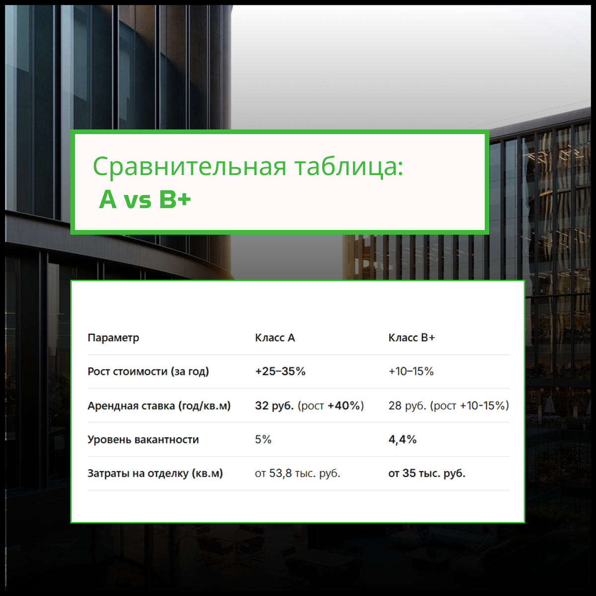 Этот вопрос актуален для всех, кто задумывается о вложениях в коммерческую недвижимость. Давайте разберёмся, основываясь на фактах. Что говорят цифры? Класс А — драйвер роста. Цены и ставки на подъёме: Увеличение стоимости на 25-35% и рост арендных ставок на 40% свидетельствуют о высоком спросе со стороны крупных, платёжеспособных арендаторов. Это инвестиции с высоким потенциалом. Хотя вакантность немного выше, крупные компании реже съезжают и более стабильны в кризис. Это актив, обеспечивающий уверенность в завтрашнем дне. Главный минус — необходимость значительных вложений не только на покупку, но и на качественную отделку. Класс B+ — стабильный денежный поток. Более низкие затраты на вход и ремонт позволяют быстрее выйти на уровень безубыточности. Вакантность составляет 4,4%, что лучше, чем у класса А. Это говорит о большом интересе со стороны среднего бизнеса, который составляет основу рынка. Данные говорят о более скромных темпах роста стоимости и арендных ставок. Это актив для п