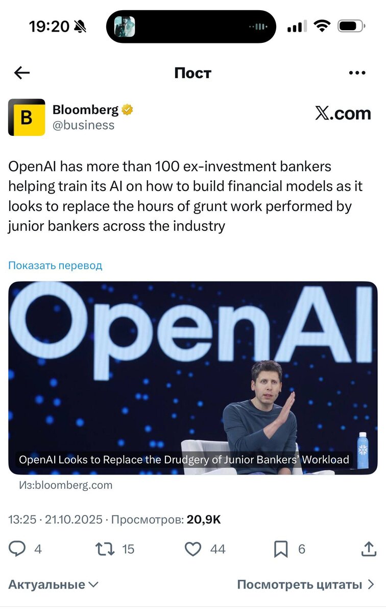 Наблюдать за тем, как OpenAI занимает всё больше пространства и превращает свой чат-бот и в расширение для браузера, и в ИИ-агента. Теперь они привлекают сотрудников крупных инвестбанков: JPMorgan, Morgan Stanley и Goldman Sachs. Те за $150 в час пишут промпты и обучают ИИ финансовым моделям. В планах — заменить младших сотрудников, есть только нюанс: пока у ChatGPT получается не очень. @lobushkin