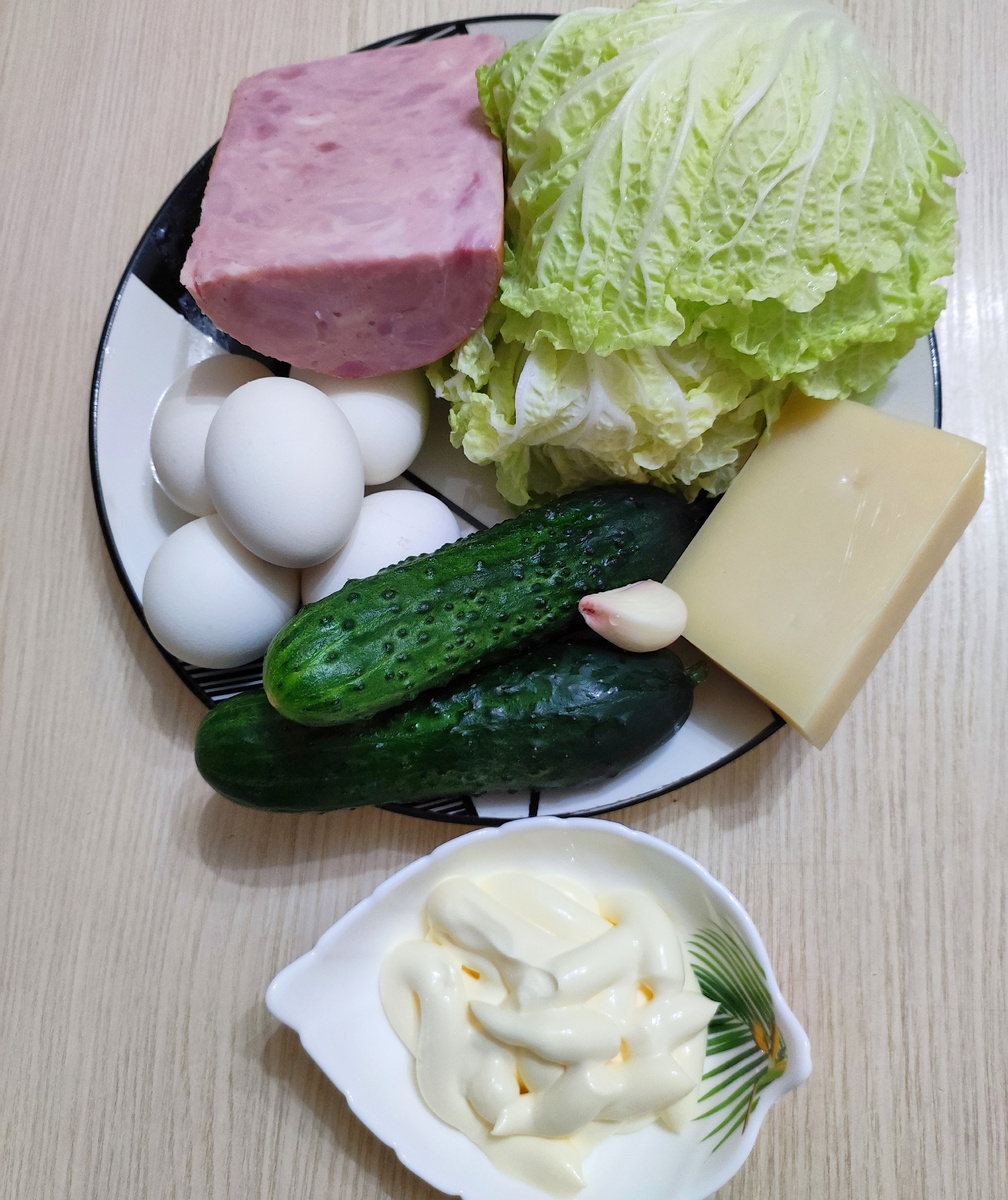 Друзья, всем привет ! Доброго осеннего дня и отличного настроения всем. А для улучшения настроения давайте приготовим легкий, быстрый и очень вкусный салат. Я готовлю его очень часто и он не надоедает. Присоединяйтесь. Нам понадобится: ветчина 300 гр, 4 вареных яйца, 2 свежих огурчика, 5-6 листочков пекинской капусты (толстую часть удаляем), 100 гр твёрдого сыра, 2 зубчика чеснока, соль, перец, майонез для заправки. Все ингредиенты нарезаем тонкой соломкой или небольшим кубиком, как вам удобно, сыр натираем на крупной тёрке, чеснок на мелкой. Соединяем всё в салатнике, заправляем майонезом, солим , перчим по вкусу. Как всегда всё очень быстро. Приятного всем аппетита. Готовьте с любовью!