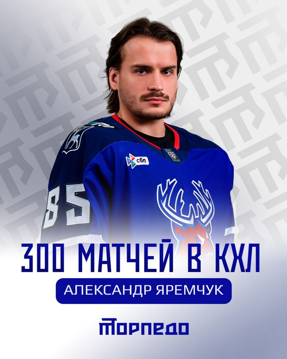 Для 🦌 Александра Яремчука сегодняшний матч в Сочи — особенный: он проводит 300-ю игру в КХЛ! 👏 Поздравляем с красивым юбилеем и желаем, чтобы впереди было ещё больше голов, побед и ярких моментов в составе «Торпедо»!🔥