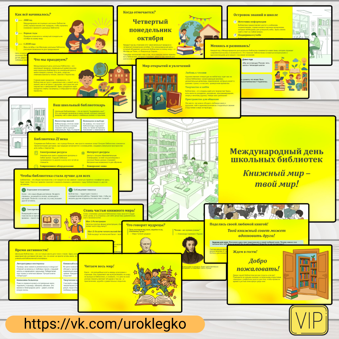 Данная презентация на 19 слайдов необходима для того, чтобы в рамках классного часа или тематического урока в школе ярко и наглядно рассказать ученикам о значении и истории Международного дня школьных библиотек, подчеркнуть их эволюцию от классических «островков знаний» к современным мультимедийным центрам, а также вовлечь школьников в активный диалог: помочь им осознать роль книг и чтения в их жизни, познакомить с работой школьного библиотекаря,