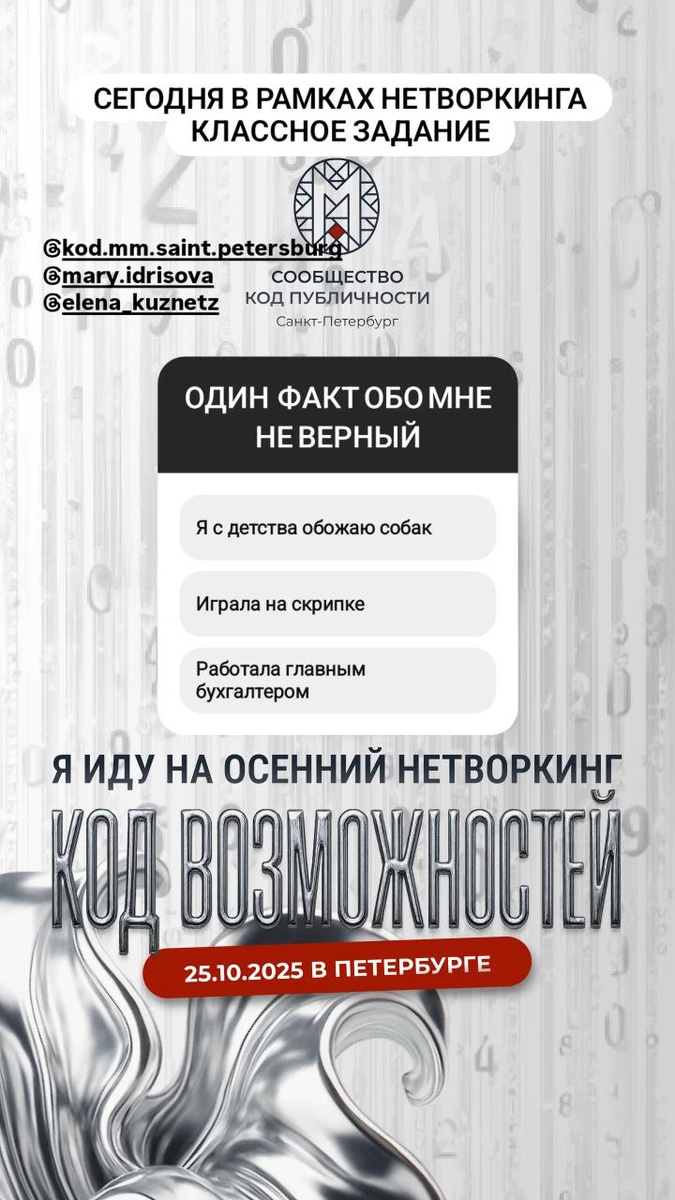 Сегодня в рамках нетворкинга в группе нетворкинга перед большим нетворкингом разыгрывает большой приз (все же поняли?) И задание просто 🔥 Три факта обо мне, где один не верный. Давайте здесь тоже выставлю. Три факта обо мне: 1. Я с детства обожаю собак 2. Играла на скрипке 3. Работала главным бухгалтером Пишите вариант в комментариях.