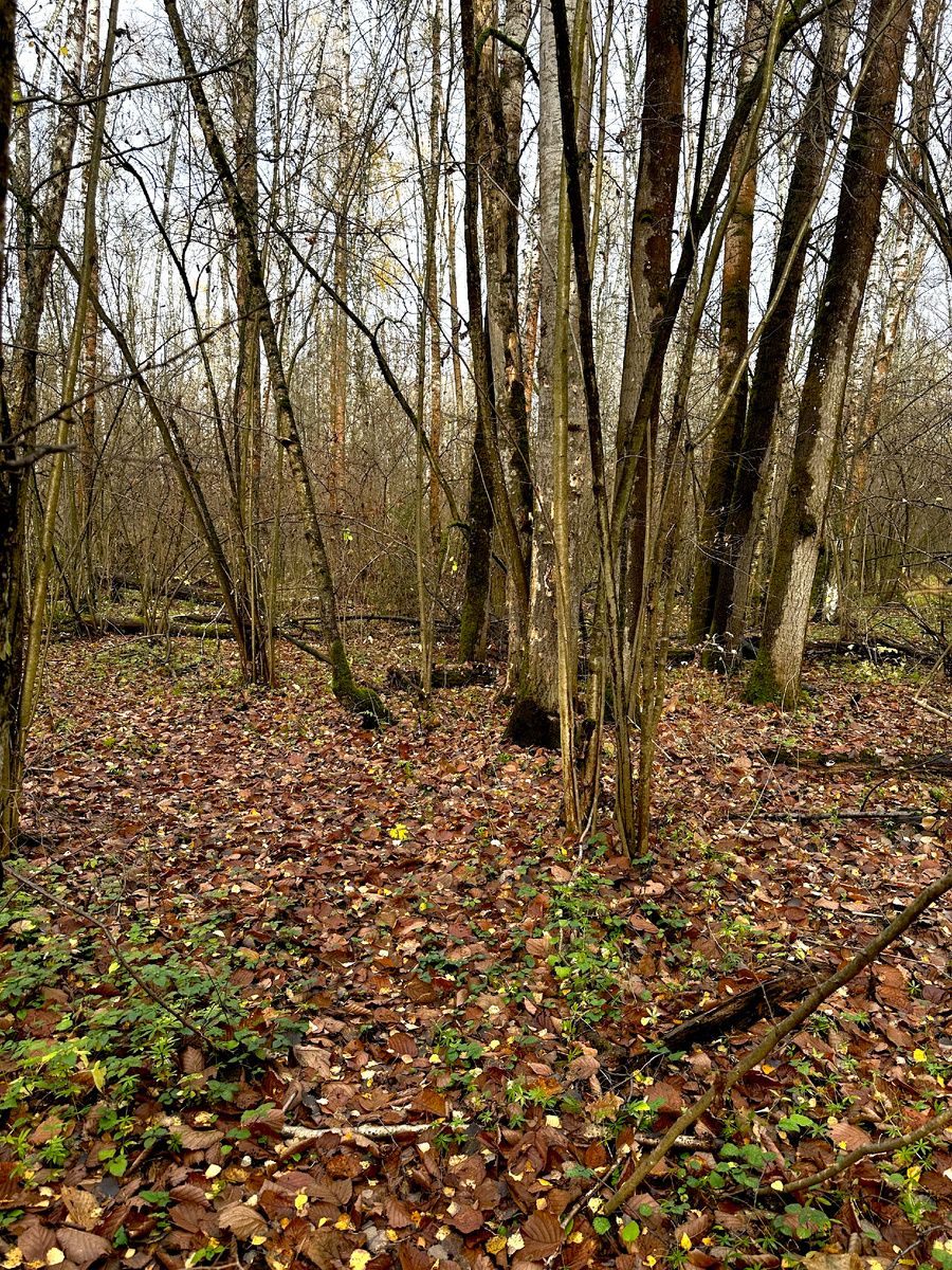 Лес кардинально переменился с последнего моего здесь появления (https://dzen.ru/b/aN7ORL7ZaCrxC5IZ) - весь влажный, от дождей набрякший. Впрочем, пересохшая за осень земля все жадно впитала - ходить можно без сапог.