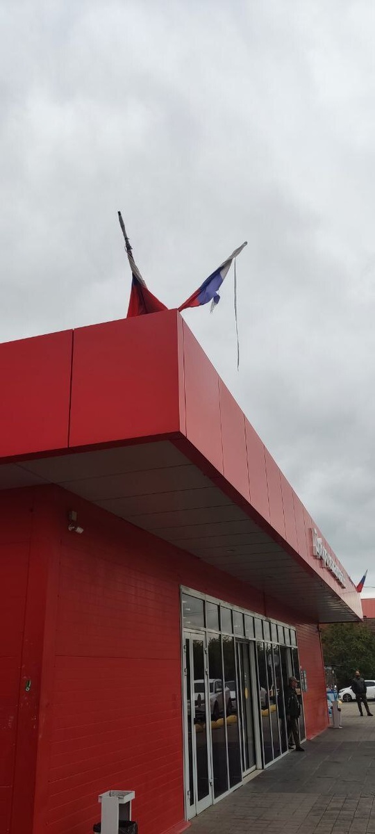 Это на гипермаркете Магнит, что на Западном рынке находится. Кровь из глаз. Такое отношение к государственной символике, что лучше бы вообще сняли, чем позориться.