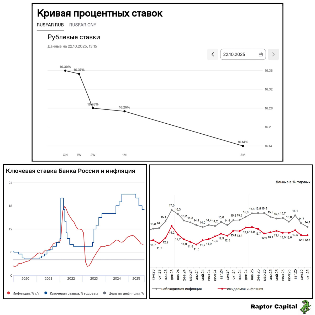 📌 Интересно, что месяц назад заголовок поста был таким же. Тогда большинство участников рынка ждали снижение ключевой ставки до 16%, но мои поиски логики в действиях ЦБ оказались верными, и ЦБ снизил ставку лишь до 17%. В пятницу 24 октября предпоследнее в этом году заседание ЦБ и решение по ставке, поэтому предлагаю пройтись по индикаторам, и подумать о реакции рынка на решение ЦБ. • Перед ЦБ сейчас лежат две папки, в одной – причины, чтобы снизить ставку до 16%, в другой – причины сохранения ставки. Попробуем сначала заглянуть в первую «папку»: 1) Кредитование. • Если в августе была нулевая динамика портфеля потребительских кредитов, то в сентябре портфель сократился на 0,1%. Кредитование не ускоряется, именно этого и добивается ЦБ. 2) Инфляционные ожидания. • В сентябре и октябре ожидаемая инфляция на минимумах за последний год (12,6%, график справа). Пока это аргумент за снижение ключевой ставки, но в ноябре инфляционные ожидания могут вырасти из-за повышения налогов. 3) Индекс PM