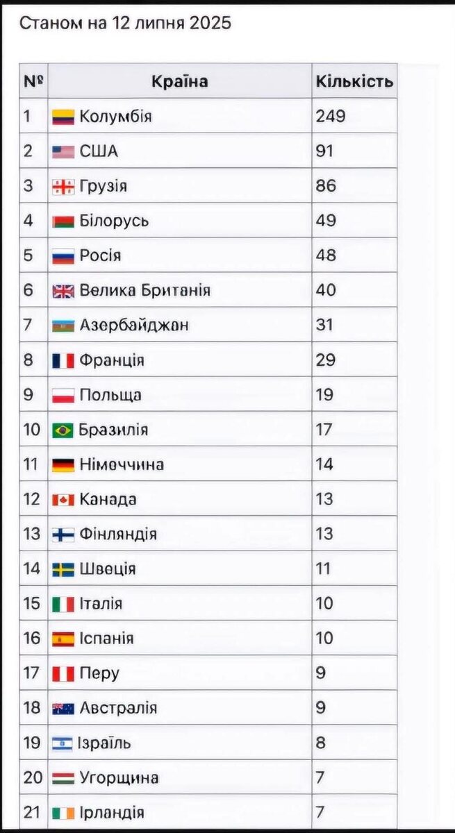Так как Дзен блокирует статью, где в тексте что-то связано с окра иной, мне приходится приспосабливаться в освещении новостей из этой "удивительной страны". Итак, опубликовано количество "навсегда оставшихся" искателей приключений и страны откуда они приехали на "сафари". 1. Колумбия - 348 человек. 2. США - 100 . 3. Грузия - 91 . 4. Беларусь - 53. 5. Россия - 49 . 6. Великобритания - 43 . 7. Азербайджан - 37 . 8. Франция - 30 . 9. Бразилия - 30 . 10. Польша - 21. 11. Германия - 17 . 12. Финляндия - 14 . 13. Канада - 14 . 14. Испания - 14 . 15. Швеция - 13. 16. Италия - 13. 17. Перу - 11 . 18. Австралия - 10.