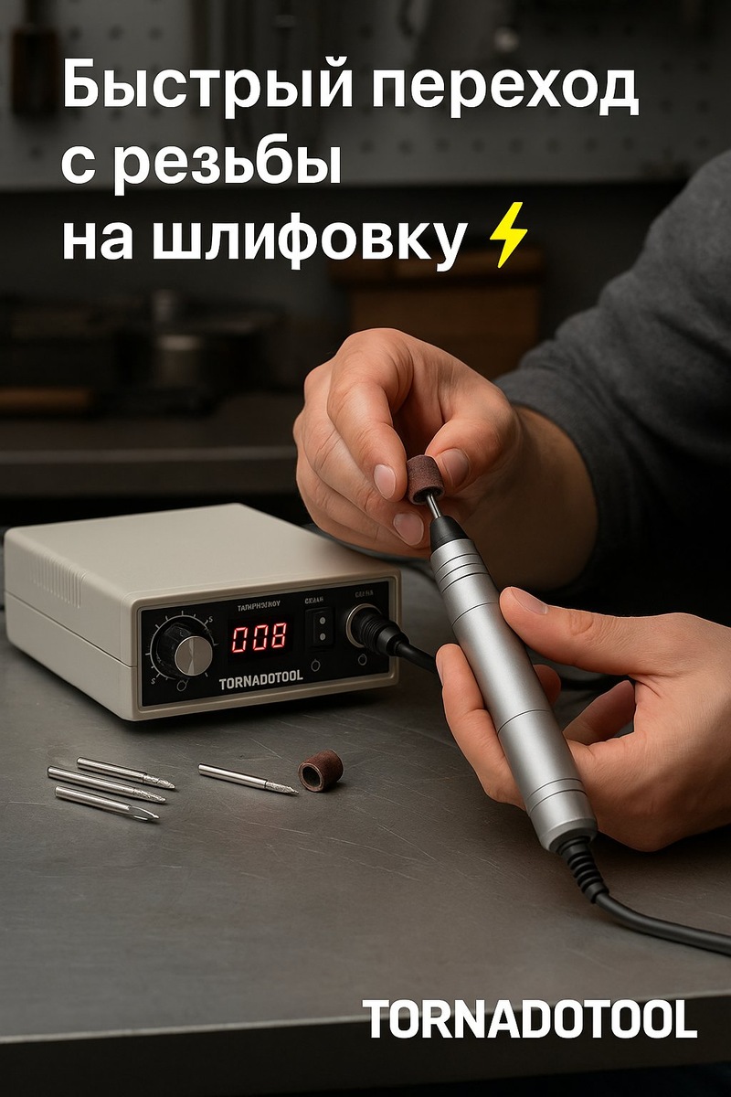 Лайфхак: быстрый переход с резьбы на шлифовку ⚡ Иногда нужно быстро сменить насадку: только что резал дерево — а уже надо отполировать кромку. Но большинство граверов на этом этапе тормозят процесс. Как работает Tornadotool: - патрон универсальный (0,5–6,5 мм) — подходит под любую насадку; - смена фрезы за 5 секунд, без ключей и цанг; - мотор не теряет момент при смене режима — можно работать сразу. 💡 Совет мастеров: Сначала грубая резьба на 7000 об/мин, потом шлифовка на 5000 — и поверхность будет как зеркало. Tornadotool — скорость не только в работе, но и в переходах.