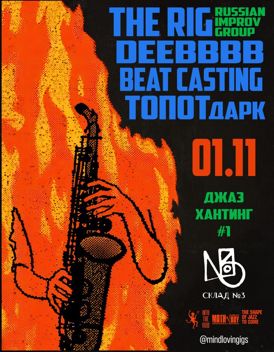 Москва ● Склад №3 ● 01.11 (Сб) ● 20:00 #dub #experimental #instrumental #jazz #post #punk #triphop ► Джаз Хантинг #1 ● TG ● VK Джазовое сафари в интерьерах каменных джунглей: от пост и дарк джаза до даба и брейк-бита. Участники: ► The RIG (Russian Improv Group) ● VK ► DEEBBBB ● TG ● VK ► ТОПОТ дарк трио ► Beat Casting ● TG ● VK Билеты от 500₽