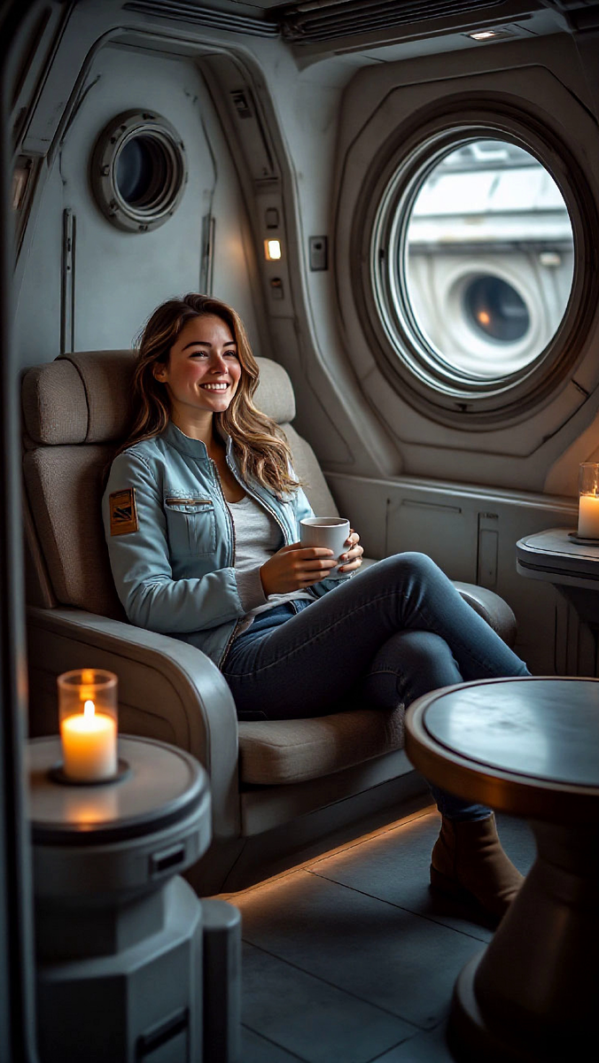 На диване у смотрового иллюминатора, откинувшись на спинку, сидит СВЕТА. Она попивает из кружки ароматный кофе, и ее плечи слегка трясутся от сдерживаемого смеха. Она смотрит на Игоря с теплой, веселой ухмылкой.