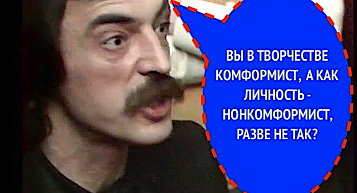 Он не смог дать однозначного и категоричного ответа на сложный вопрос о своем конформизме в творчестве. Вместо прямого отрицания или согласия, он выбрал путь объяснений и частичных оправданий, ссылаясь на объективные ограничения ("выше головы не прыгнуть") и возможности проявить протест лишь в некоторых работах. Его ответ отражает внутреннюю двойственность и готовность идти на компромиссы ради возможности заниматься любимым делом, что не позволяет ему пройти детектор лжи по вопросу о творческом конформизме. Последняя фраза и вовсе вносит путаницу, не проясняя его позицию.