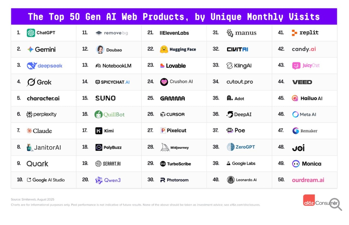 🔝Топ-50 нейросетей (GenAI) - гид по типам под задачи (сохраняй) Вдохновился подборкой a16z Consumer, тренд на рост "vibe coding" и генераторов приложений, сохраняйте подборку, что бы не потерять Нажмите на щуку — она исполнит ваше самое заветное желание: ⭐️⭐️⭐️⭐️⭐️⭐️⭐️⭐️⭐️⭐️ ⭐️⭐️⭐️⭐️⭐️⭐️⭐️⭐️⭐️⭐️ ⭐️⭐️⭐️⭐️⭐️⭐️⭐️ Нейросети, соцсети и мессенджеры без VPN 🌟 - кабы не так, стабильный VPNчик Или выбирайте с минимальным набором локаций: США East, США West, Германия или Нидерланды, Великобритания, Финляндия или Польша, Турция или Казахстан, Сингапур или Япония, Швейцария, с вариантами WireGuard-over-TCP, запасной OpenVPN TCP 443, запасной IKEv2, и конечно же с поддержкой обфускации, что выбрать ссылка вверху 🔝