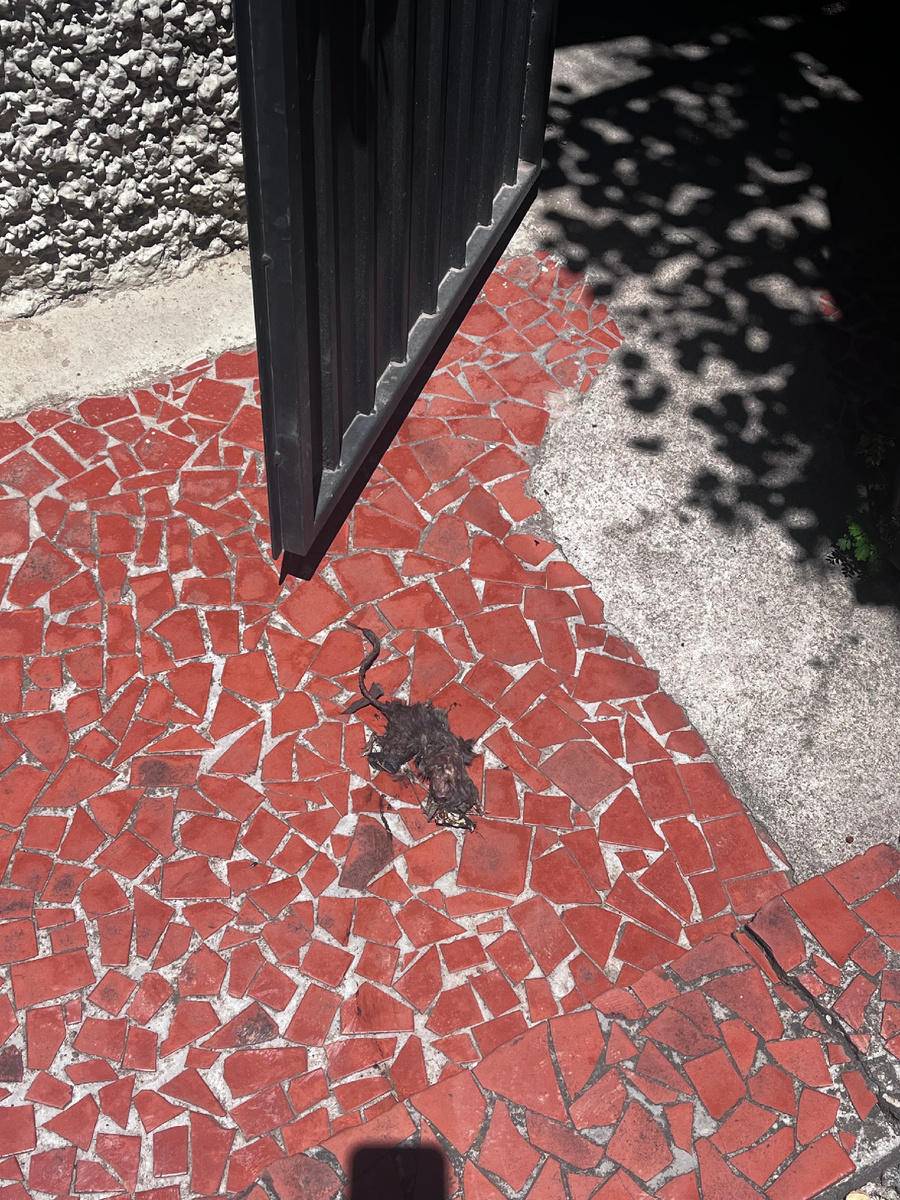 Утром встала в полседьмого, чтобы вытащить на улицу мусор, и обнаружила прямо возле нашей железной двери (входа в наш личный двор) дохлую раздавленную крысу.
