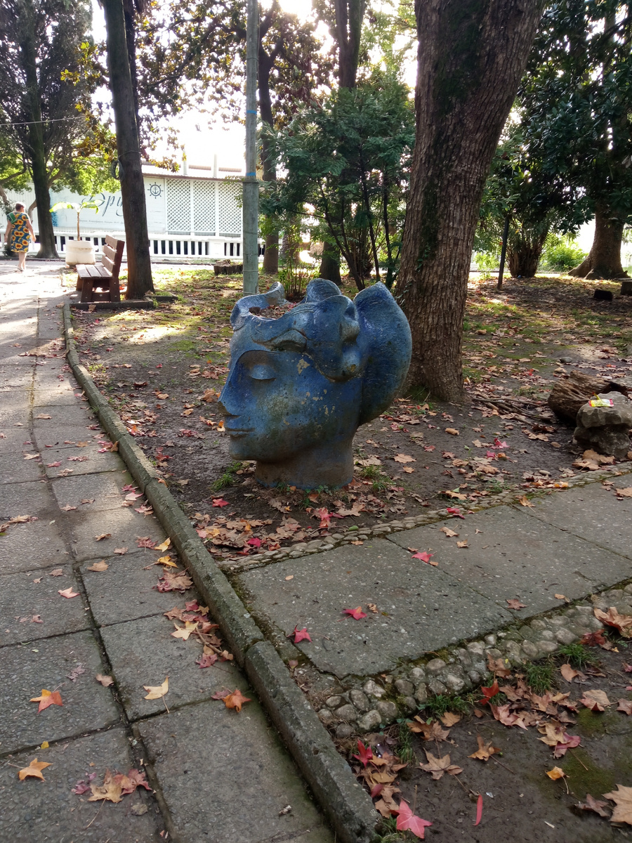 Ура! Сегодня я ночую в городе в отеле Солнечный берег . Купила путевку на 2 дня за смешную цену . Проживание и трёхразовое питание за 2 дня стоит всего 396 рублей , плюс миграционный сбор 200 рублей (на 3 месяца). Что с буду делать вечером ? Конечно , гулять по набережной . Недалеко от нашего корпуса на аллее стоят известные вазоны в виде человеческих голов. Эти головы были когда-то частью композиции "Путешествие в небо" Геннадия Лакоба. Сейчас из 12 голов- вазонов осталось только 6. Пять находятся здесь, а шестая на набережной Махаджиров около бывшего ресторана Белый парус. На закрытой территории заброшенного завода «Аргонавт» в городе Ткуарчал находится инопланетная скульптурная композиция. «Путешествие в небо»- так называется эта необычная скульптура. Автор — абхазский скульптор Геннадий Лакоба. Скульптор родился в Сухуме в 1948 году, окончил Тбилисскую академию художеств, продолжил обучение в Институте живописи, скульптуры и архитектуры им. И.Е. Репина. Ткуарчальская работа дл