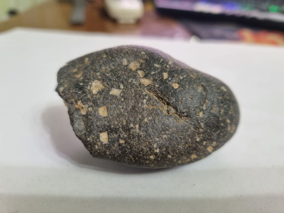 «Камень похожий на метеорит найден в пустыне, недалеко от посёлка Улан-Хол в Лаганском р-не Калмыкии. В одном месте имеются каверны похожие на остаточные следы расплавной корки. Слабо магнитится сильным магнитом. Светлые вкрапления визуально имеют кристаллическую структуру и преимущественно прямоугольные формы. Может ли это быть метеоритом?» — спрашивает наш подписчик V S. Отвечает геолог Павел Селиванов: «Визуально порода похожа на вулканическую породу типа базальта или андезита, можно различить что основная масса чрезвычайно мелкозернистая, возможно даже частично стекловатая, на фоне которой резко выделяются изолированные белые вкрапленники, судя по всему, плагиоклаза. Так же на сколе различимы темные кристаллы с ромбическим сечением, вероятнее всего, роговая обманка. Округлая форма со сглаженной поверхностью намекает нам на то, что камень довольно продолжительное время подвергался механическому воздействию, например, транспортировке в водной среде. Что касается пористой "корки", то