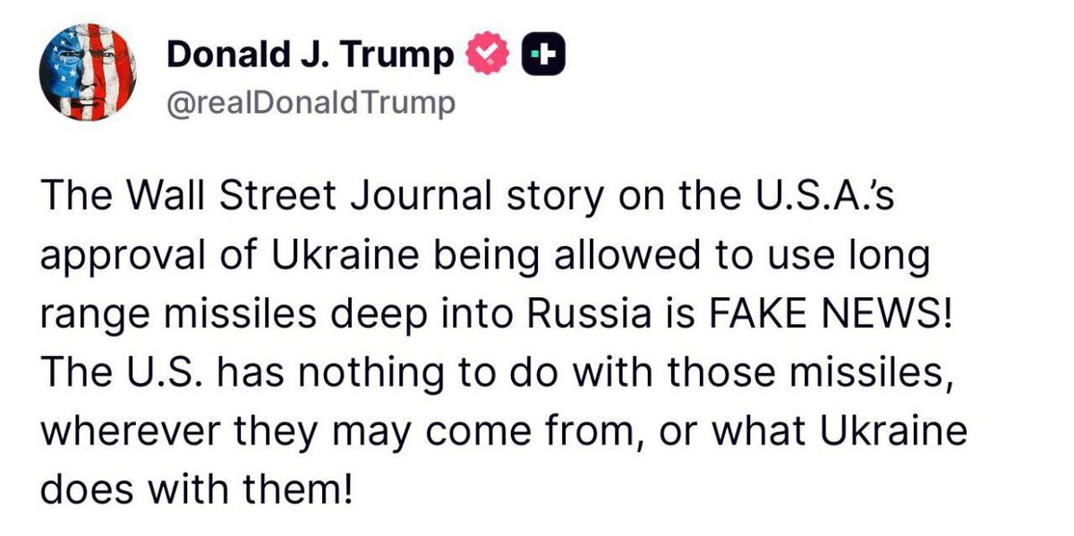 Трамп опровергнул утверждения WSJ о том, что США якобы разрешили Киеву наносить дальнобойные удары по РФ и назвал их «фейком».