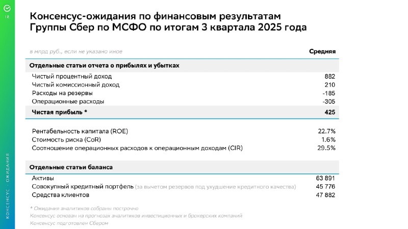 Аналитики ожидают, что чистая прибыль банка по итогам третьего квартала 2025 года по МСФО составит, согласно средней оценке, 425 млрд. Это следует из опроса аналитиков инвестиционных и брокерских компаний, который провел банк. Результаты опроса приводятся в рассылке Investor Relations «а», которая есть в распоряжении « Инвестиций». Финансовые результаты группы по МСФО за третий квартал 2025 года будут опубликованы 28 октября.