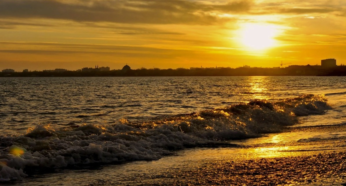 Пляжи под Евпаторией радуют ровным песком и тёплым морем. На закате небо и вода сливаются в золотистый оттенок.