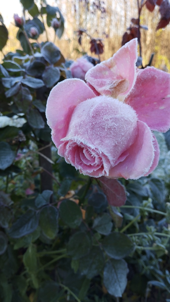 Вышла на улицу, а там такое… все белым-бело от инея, трава хрустит под ногами, а все, что еще продолжает цвести, будто бы оделось в хрустальные наряды. Настоящее царство льда…