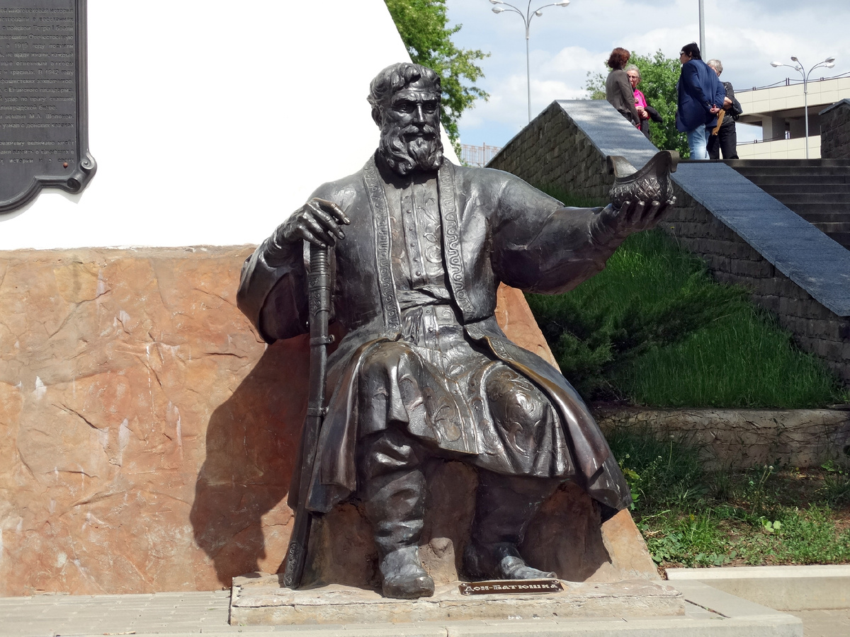 В станице Вёшенской, что в Ростовской области, есть на что посмотреть. Например, тут очень красивая природа. Станица стоит на высоком левом берегу Дона и с набережной открываются прекрасные виды на окрестности. Но на здешней набережной можно любоваться не только природными пейзажами. Есть тут и интересные памятники. Один из них, памятник Григорию и Аксинье - героям романа "Тихий Дон", знает, наверное, вся Россия, причём даже те люди, которые в Вёшенской ранее не бывали. Но есть и ещё один памятник, стоящий буквально в нескольких метрах от памятника Григорию и Аксинье. Это памятник Дону-батюшке. Этот памятник не так известен, как его сосед и находится несколько ниже. Чтобы его увидеть, нужно спуститься вниз по лестнице от Григория и Аксиньи. Гуляя по набережной памятник Дону-батюшке можно и не заметить. Он не очень большой, чтобы его увидеть, надо спуститься по лестнице. Но от нашей группы руссо-туристо он не скрылся. Увидев лестницу, пытливые умы членов нашей группы задались вопросом