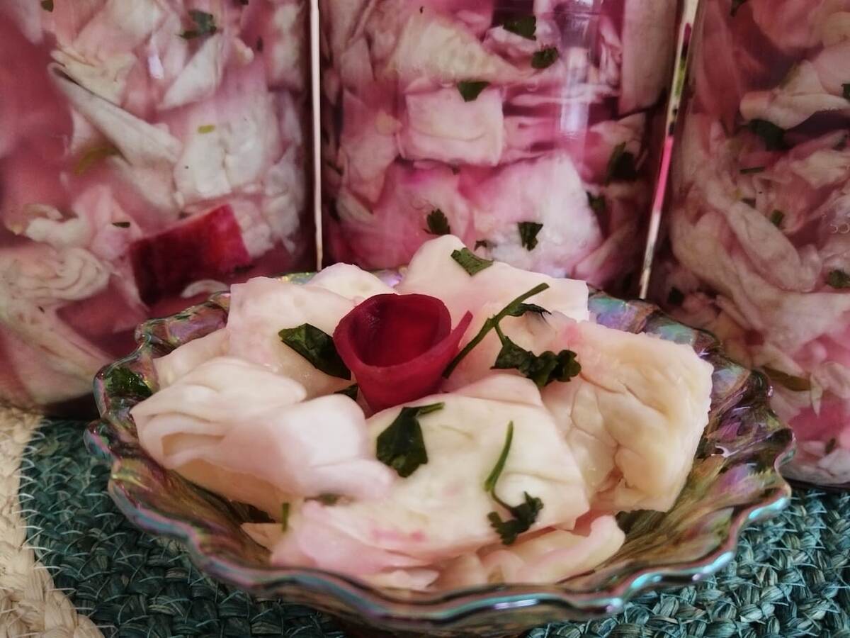 Эти два рецепта – настоящая находка для тех, кто ценит вкус, пользу и простоту. Первый вариант порадует вас своей скоростью и пикантностью, идеально подойдет для тех, кто не любит долго ждать. А второй – это настоящий зимний витаминный заряд, который не только украсит ваш стол, но и станет прекрасной основой для наваристого борща. Этот рецепт меня покорил своей скоростью приготовления – всего 7 дней, и у вас на столе хрустящая, ароматная капуста с приятной остринкой. Ингредиенты: Для рассола: Капусту очистите от верхних листьев и нарежьте крупными кусками (примерно по 200-300 гр), предварительно удалив кочерыжку. Корень хрена очистите и натрите на терке или мелко нарежьте. Чеснок и зелень петрушки измельчите. Свеклу нарежьте кубиками. В эмалированную кастрюлю укладывайте капусту, пересыпая ее подготовленными овощами и пряностями слоями. Если любите поострее, добавьте стручки горького перца. Приготовьте рассол: в воде растворите соль и сахар. Залейте капусту теплым рассолом. Сверху