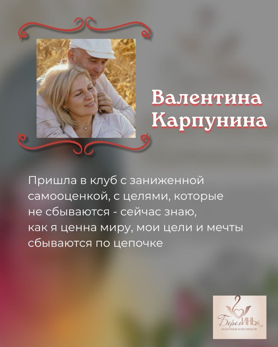 🌸Валентина Карпунина Участница Мастерской Женского Развития "Изобилие" 😊 Замужем, есть две взрослые дочери 😊 Занимается Автохозяйством более 25 лет 😊 "Берегинья" - Это семья, где поддерживают, подсветят твой путь на своем примере, это доброта и неподдельная любовь! 😊 Пришла в клуб с запросом научиться быть женственной, мягкой ж, текучей, признать- что со мной все так, и в то же время идти к своей мечте, ставить цели и радоваться, когда все сбывается ! 😊 Что бы посоветовали женщинам, которые хотят вступить, но не решатся? Надо попробовать и тогда уже не уйдешь, здесь так много интересного, и мощная поддержка !!! 😊 Пришла в клуб с заниженной самооценкой, с целями, которые не сбываются- сейчас знаю, как я ценна миру, мои цели и мечты сбываются по цепочки. ☺️Это открытие семейной школы для женщин!!! ☺️Налаженные отношения с мужем. Знаю, что впереди много нового и интересного ❤️❤️❤️ *Сейчас у вас есть возможность присоединиться к сообществу на 5 дней бесплатно ➡️Если вы уже н