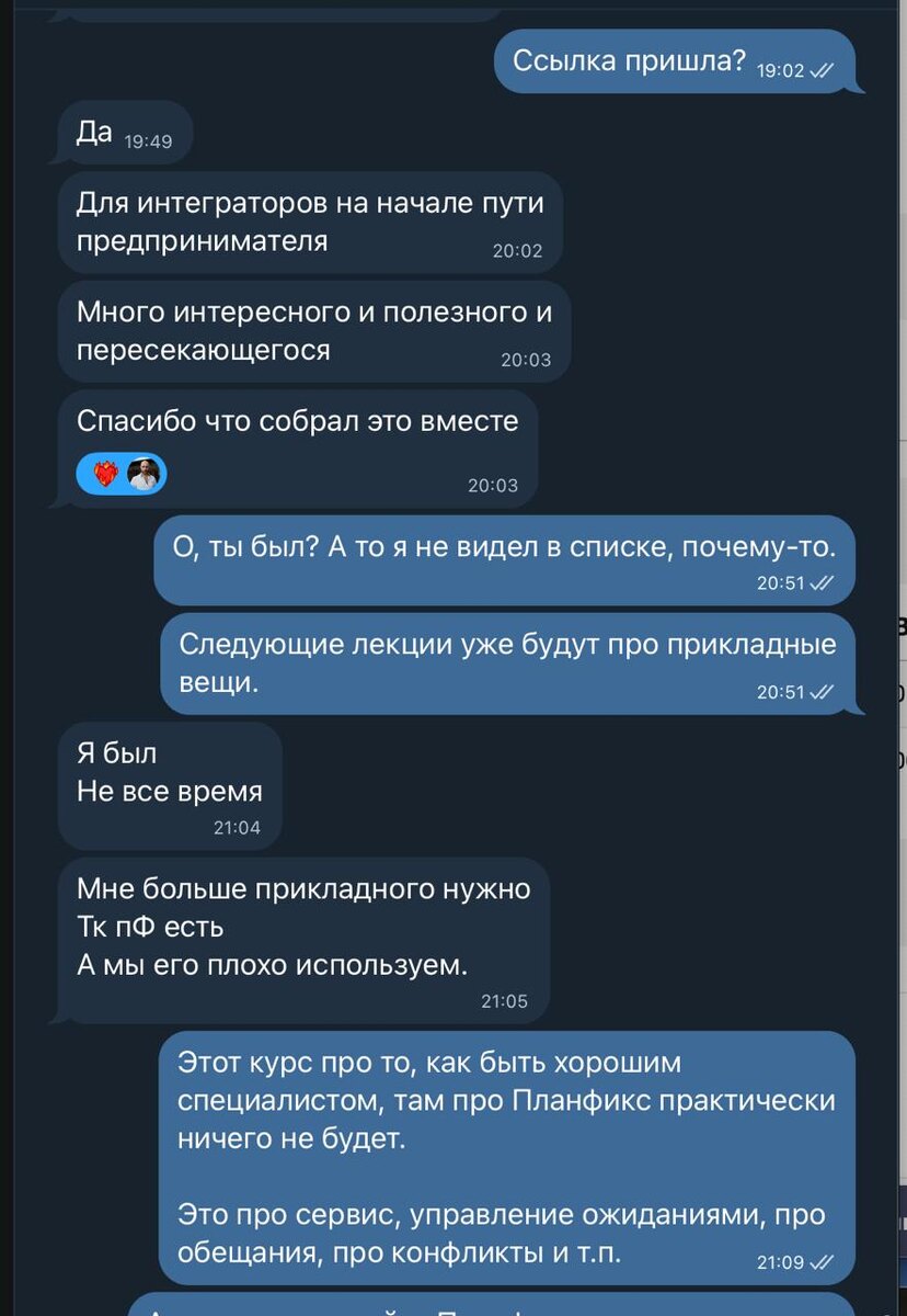 Прошла первая лекция на курсе “Хороший интегратор” Постарался дать картинку, к чему надо быть готовым и как поискать первопричину внутри себя. Отдельно подсветил проблему общения между людьми, ее мы будем развивать на новых лекциях. По плану встречи для обсуждения будут в понедельник, но есть запрос изменения дня, буду обсуждать с курсантами. p.s. Важно! Этот курс не про Планфикс, он про любую работу, в которой ценится профессионализм!