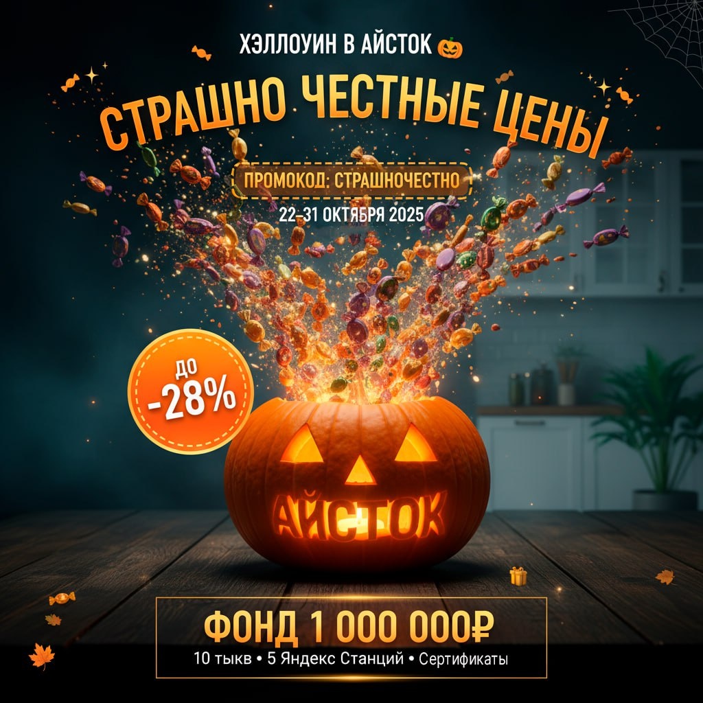 БУ! 👻 Испугались? Нам самим СТРАШНО от того, что мы устроили... 🎃 Скидки до -28% 💰 Фонд 1 000 000₽ 🍬 Собирай конфеты каждый день 🎁 Выигрывай Яндекс Станции и технику Промокод: СТРАШНОЧЕСТНО -13% Мы до сих пор в шоке 😱 СРОЧНО СМОТРИ 👉 https://айсток.рф/halloween ⏰ Только 22-31 октября АЙСТОК | Страшно честные цены