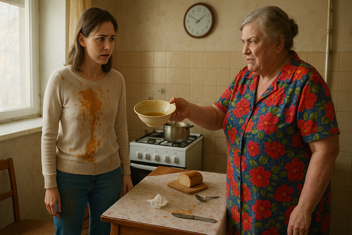 Татьяна встала. Медленно, не отрывая взгляда от свекрови. Вытерла лицо ладонью. Бульон капал с подбородка на пол, оставляя жирные пятна на линолеуме.