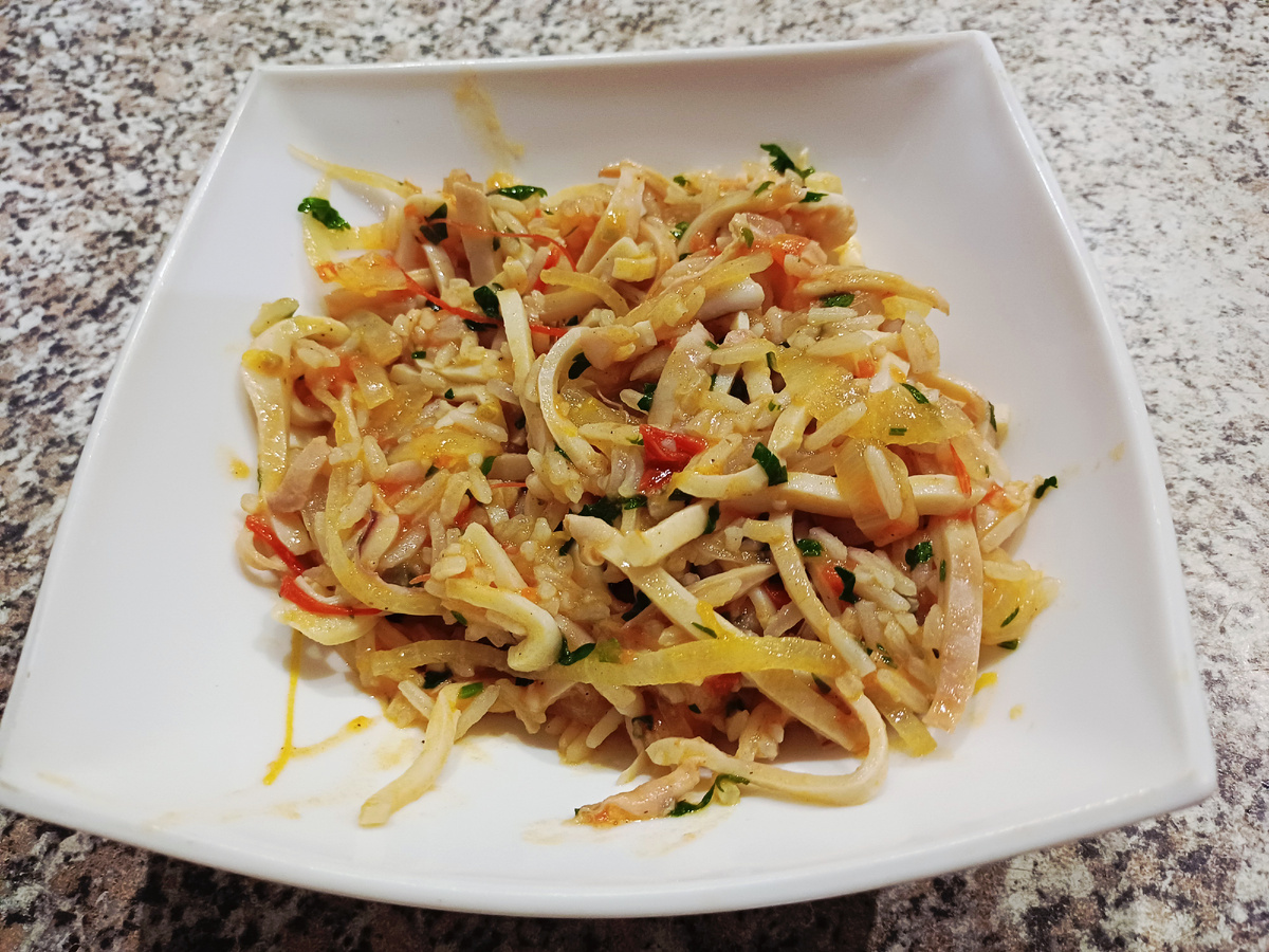Для приготовления понадобятся следующие продукты: 500 гр. кальмаров (очищенных), 100 гр. риса басмати, 300 гр. помидоров, 200 гр. репчатого лука, соль,перец,зелень,растительное масло по вкусу. Рис отварить до готовности,промыть холодной водой. Кальмаров очистить от плёнок, промыть и залить кипятком на 2-3 минуты,затем воду слить и ещё раз залить кипятком на 3 минуты. Воду слить,промыть кальмаров холодной водой и нарезать соломкой. Лук и помидоры нарезать полукольцами. На растительном масле обжарить лук до лёгкой золотистости, затем добавить помидоры и тушить 5-6 минут. Выложить рис, кальмары,добавить по вкусу специи и хорошо перемешать. Тушить одну минуту, добавить зелень,перемешать и снять с огня. Приятного аппетита!