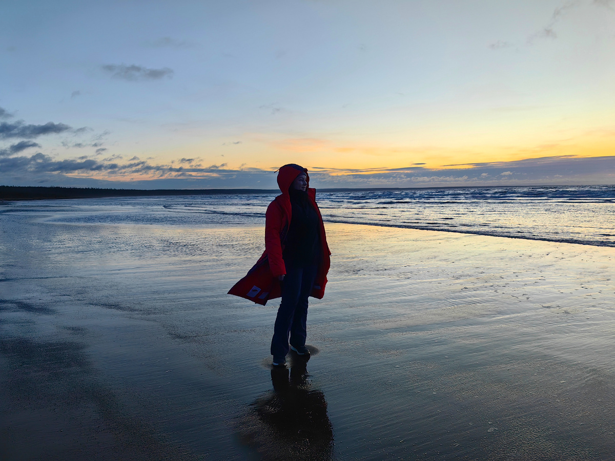 Мы встретили утро на пустынном берегу с отливом, по дороге из Умбы на Тоню Тетрину. Казалось, весь мир только для нас.