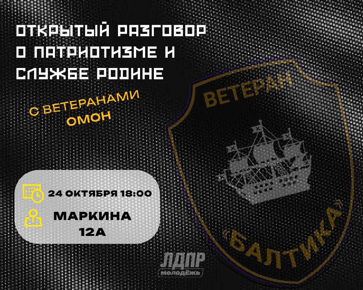 Открытый разговор о патриотизме и службе с ветеранами ОМОН «БАЛТИКА» Санкт-Петербургское региональное отделение ЛДПР приглашает всех желающих на встречу с героями нашего времени - ветеранами боевых действий на Северном Кавказе, представителями Санкт-Петербургской общественной организации ветеранов ОМОН «БАЛТИКА» (на транспорте). 🗓 Дата: 24 октября, в 18:00 📍 Адрес: ул. Маркина, 12А В открытом разговоре примут участие: • Вадим Юрьевич Матвеев, ветеран боевых действий на Северном Кавказе, председатель Совета ветеранов ОМОН «БАЛТИКА» (на транспорте) ГУ Росгвардии по Санкт-Петербургу и Ленинградской области. • Виталий Викторович Архипов, ветеран боевых действий на Северном Кавказе, член Совета ветеранов ОМОН «БАЛТИКА» (на транспорте) ГУ Росгвардии по Санкт-Петербургу и Ленинградской области. Будем говорить о настоящем патриотизме, долге, службе и личных историях мужества. Приглашаем всех, кто неравнодушен к теме защиты Родины и хочет задать свои вопросы участникам! Формат встречи -