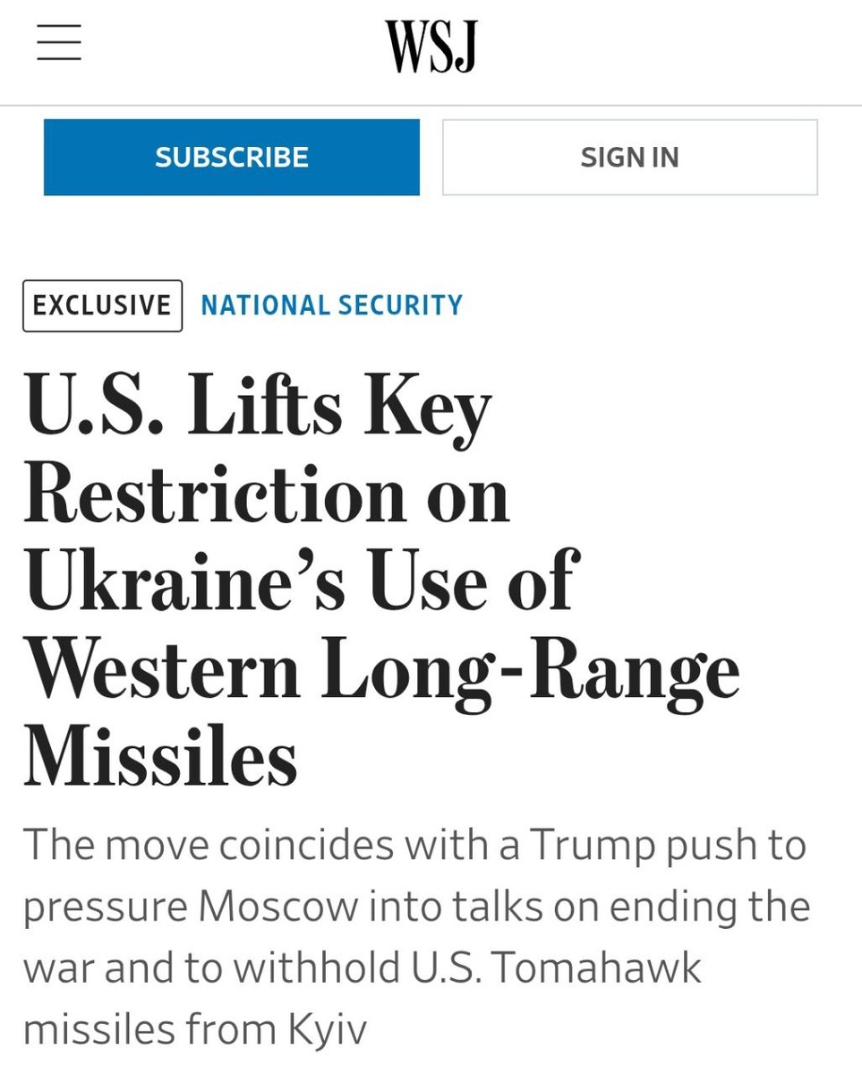 WSJ cites ‘US officials’, who say it’ll let Zelensky 'step up attacks on targets inside Russia' And 'increase pressure on Kremlin' Trump's still 'withholding Tomahawk missiles from Kiev' WSJ adds Ukraine now has green light to use Storm Shadow missiles on targets inside Russia