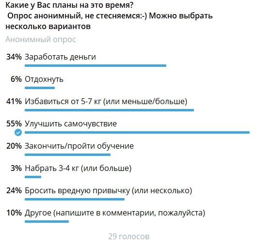 До конца года 70 дней! Какие у Вас планы до конца года? Что еще можно успеть? Давайте посмотрим на результаты опроса, и чем я Вам могу помочь: 55% хотят улучшить самочувствие. Вы - в правильном месте! Пишите мне @maria_pachina и договоримся о диагностике, где я расскажу о возможных решениях именно для Вас 41% хотят избавиться от 5-7 кг! Пишите мне в лс или в комментариях "Стройность", и я пришлю Вам предложение! 34% хотят заработать деньги. Аюрведа считает, что базис- это здоровье. Если у Вас есть здоровье, то Вы можете следовать своему предназначению, и тогда у Вас есть и деньги, и почет, и уважение. Куда приходить за здоровьем, Вы сами уже поняли😊 24% хотят бросить вредную привычку. У меня есть опыт проведения сессии по психосоматике, после которой человек бросил курить. Приходите, будем разбираться:-) 20% закончить или пройти обучение. Обнимемся, я тоже такая😊 6% хотят отдохнуть. Могу Вам предложить поехать в аюрведическую клинику😊 или хотя бы сделать аюрведический массаж