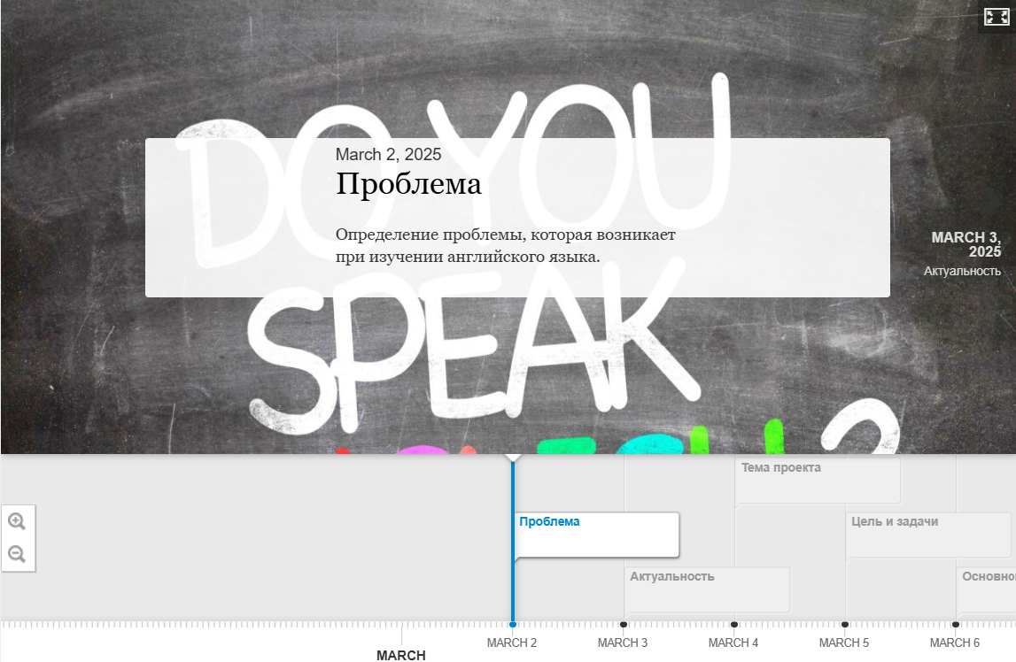 Рассмотрите представленную хронолинию проекта и выполните следующее задание: Внимательно читая каждый слайд в данной хронолинии и просматривая прошлые статьи, заполните пропуски в слайдах хронолинии. Что бы вы еще предложили добавить в проект, чтобы сделать его более успешным и эффективным для обучающихся? Эти задачи помогут лучше ознакомиться с проектом и научиться самостоятельно выполнять работу.
