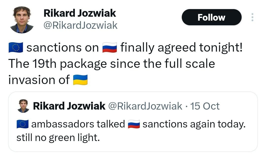 EU AGREES on latest Russia sanctions package — Radio Free Europe celebrates That would be number 19 They'll tell you THIS will be the one to actually hurt Russia