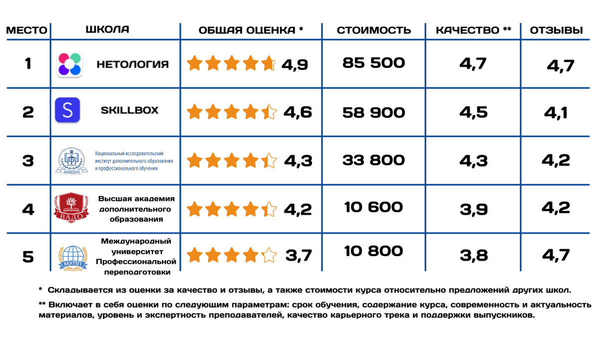 - Отзывы. В рейтинг вошли онлайн-школы, выпускники которых остались довольны обучением и успешно начали свой путь в карьере фитнес-тренера.