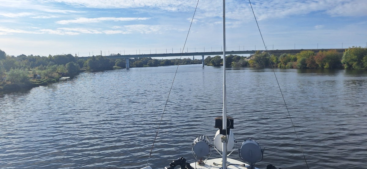 Пришлось прервать рассказ о завершении круизного сезона: пригласили на 1 научно-практическую конференцию "Костинская экономия Н.Я. Никитинского. Возрождение. Развитие. Память" в селе Костино, подготовить доклад, выступить, а затем написать репортаж об этом событии. Так что, извините за задержку. Заканчиваю рассказ о сентябрьском круизе, ссылку на начало приведу дальше. Гидроузел Фаустово проплыли, впереди виден мост автодороги А-107 Московского малого бетонного кольца. От нас на левом берегу, а по течению на правом - город Бронницы. Сам город стоит на старом русле реки, поэтому только издалека мы видим достопримечательность Бронниц - колокольню собора Архангела Михаила. Бронницы впервые упоминаются в духовной грамоте Софьи Витовтовны от 1453 года как "прикупное село Бронниче на Астраханском тракте". Софья Витовтовна, жена Василия I Дмитриевича (сына Дмитрия Донского) и дочь литовского князя Витовта сыграла важную роль в становлении Московского государства. Василий Дмитриевич умирает