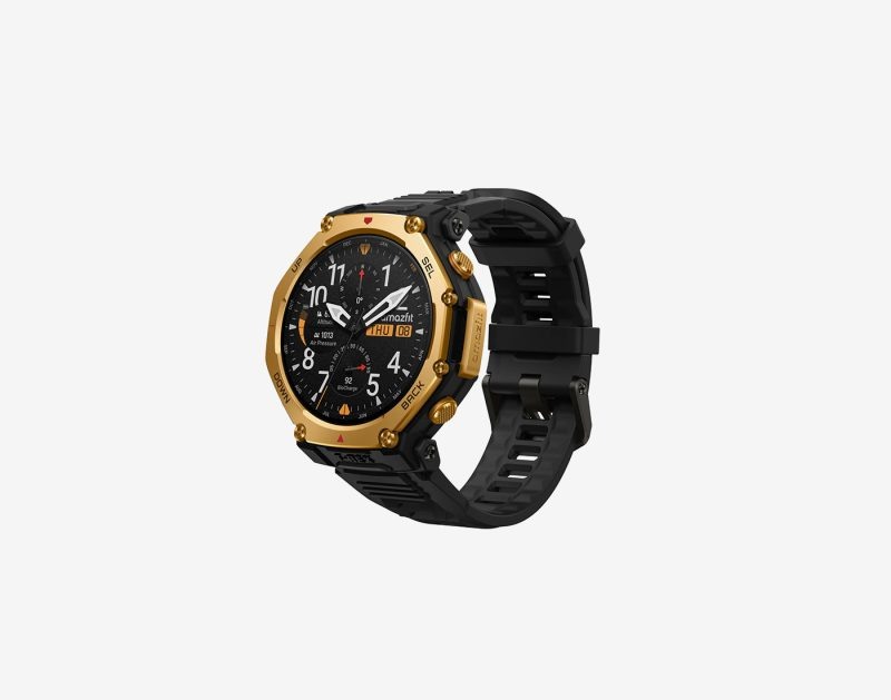 Часы Amazfit T-Rex 3 Pro продаются в двух цветах — классическом «тактическом черном» и более необычном варианте, где черный сочетается с золотым. И второй вариант выглядит реально эффектно. Мне кажется, он создан для тех, кто хочет чуть выделиться из толпы, но без перебора. У меня на обзоре как раз была эта версия, и скажу честно — понравилась. Смотрится дорого, но при этом не вычурно.